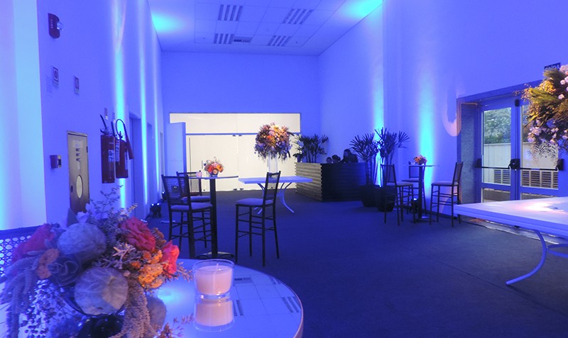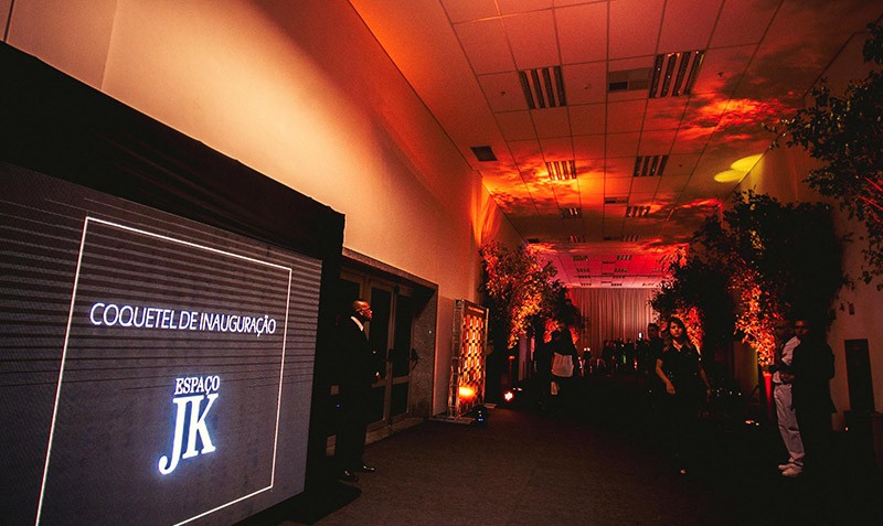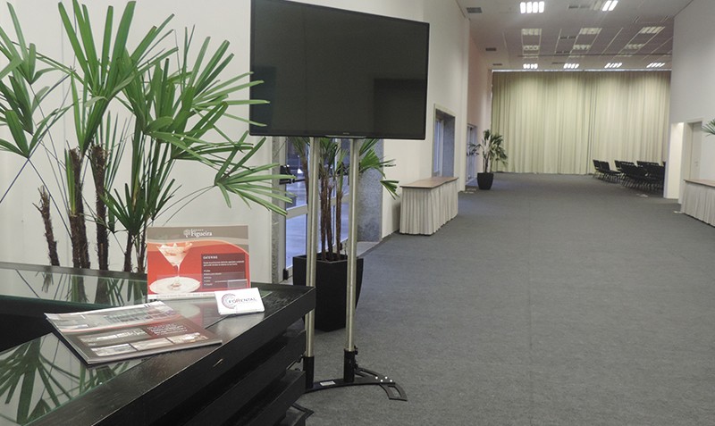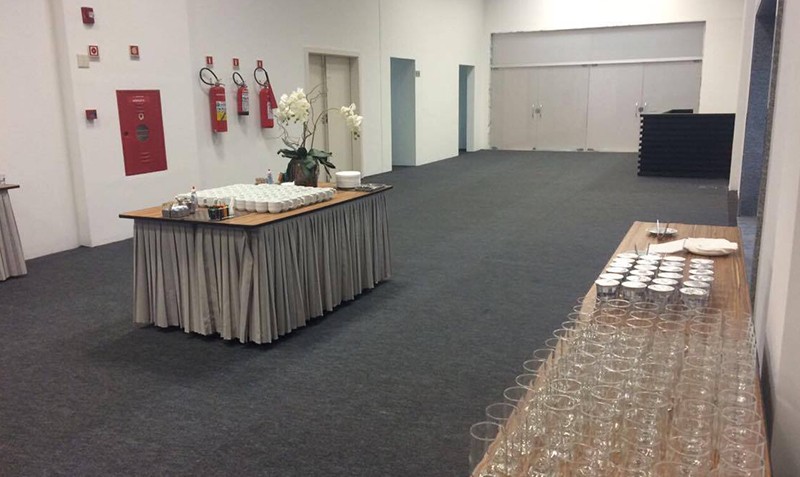 Foyer de 150 m² com recepção e pé direito de 5,25 m, capacidade para até 200 pessoas. Seve como área complementar para coffees, almoços e outras funcionalidades.