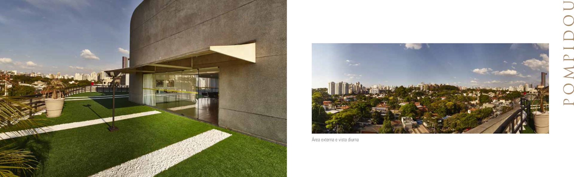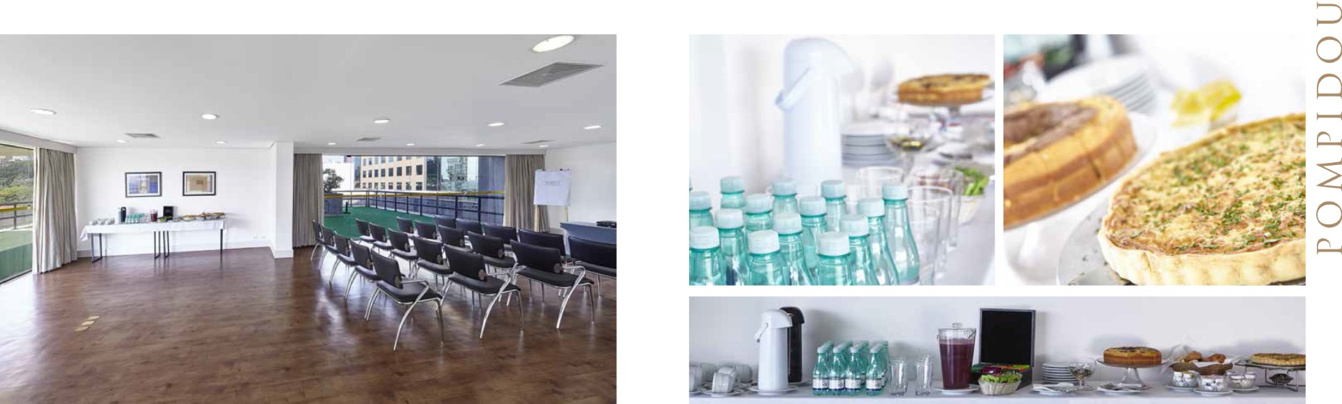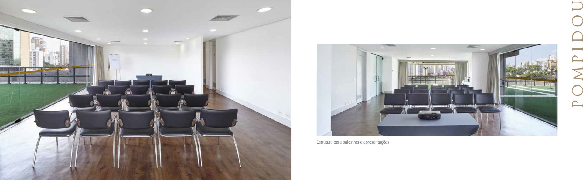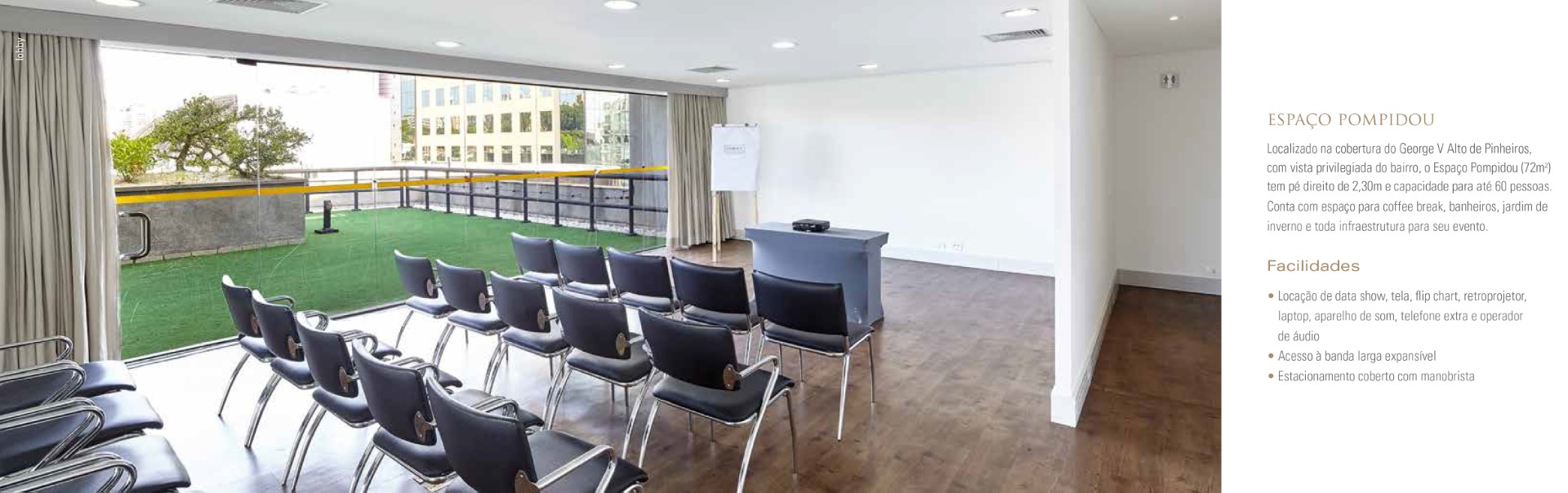 Localizado no roof top do George V Alto de Pinheiros, com vista privilegiada do bairro, o Espaço Pompidou (72m²) tem pé direito de 2,30m e capacidade para até 60 pessoas. Conta com espaço para coffee break, banheiros, terraço e toda infraestrutura para seu evento.
