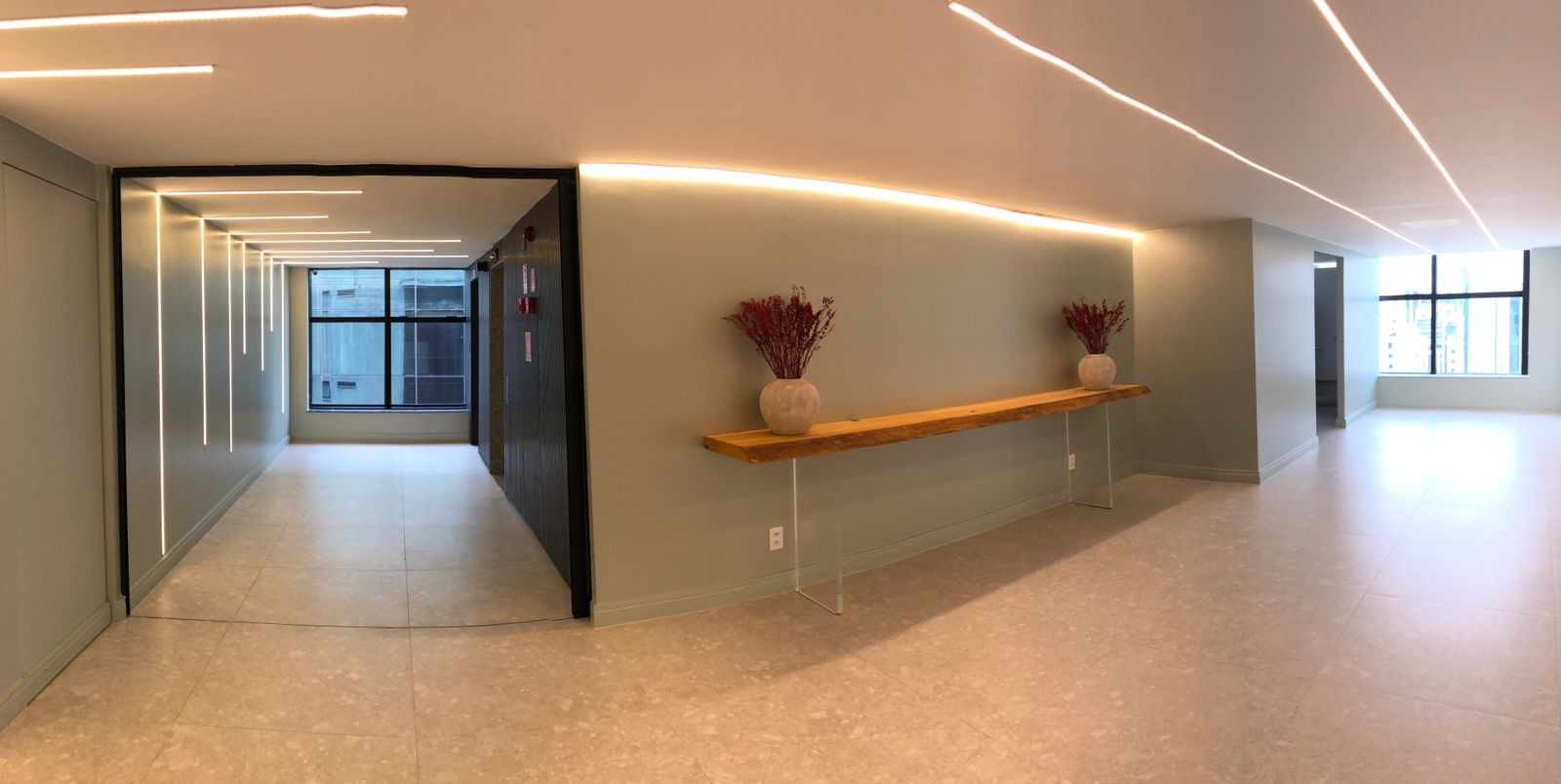 Ocupa todo um andar. Elevador exclusivo, recepção, foyer, sala de reunião e cozinha gourmet.