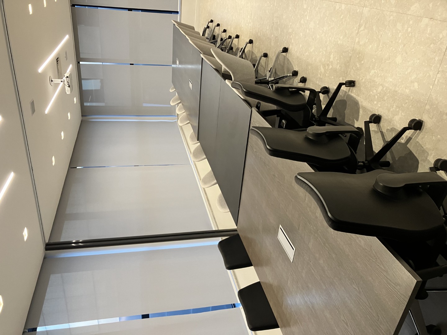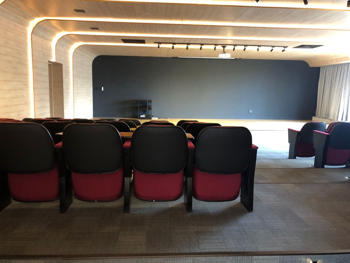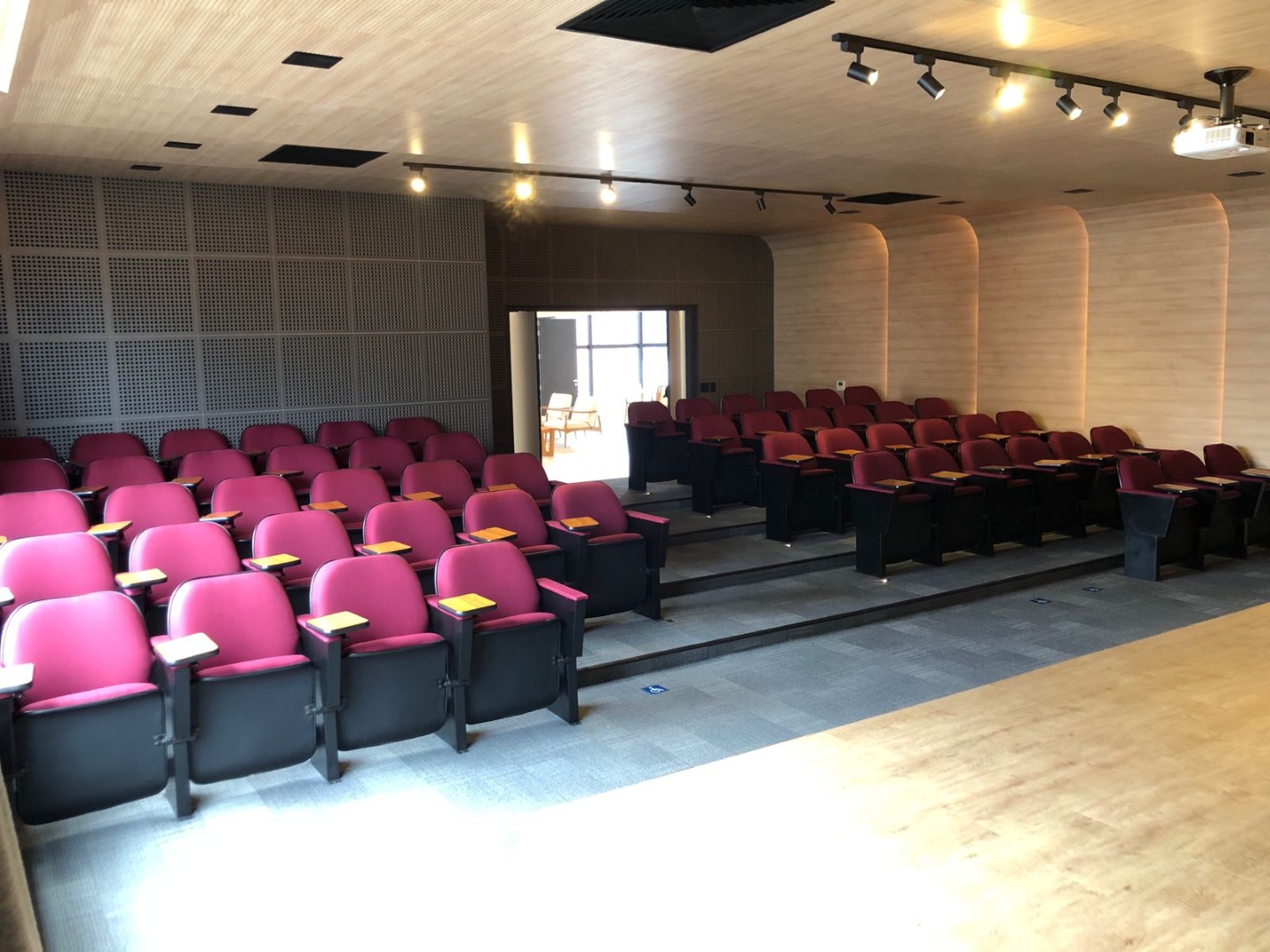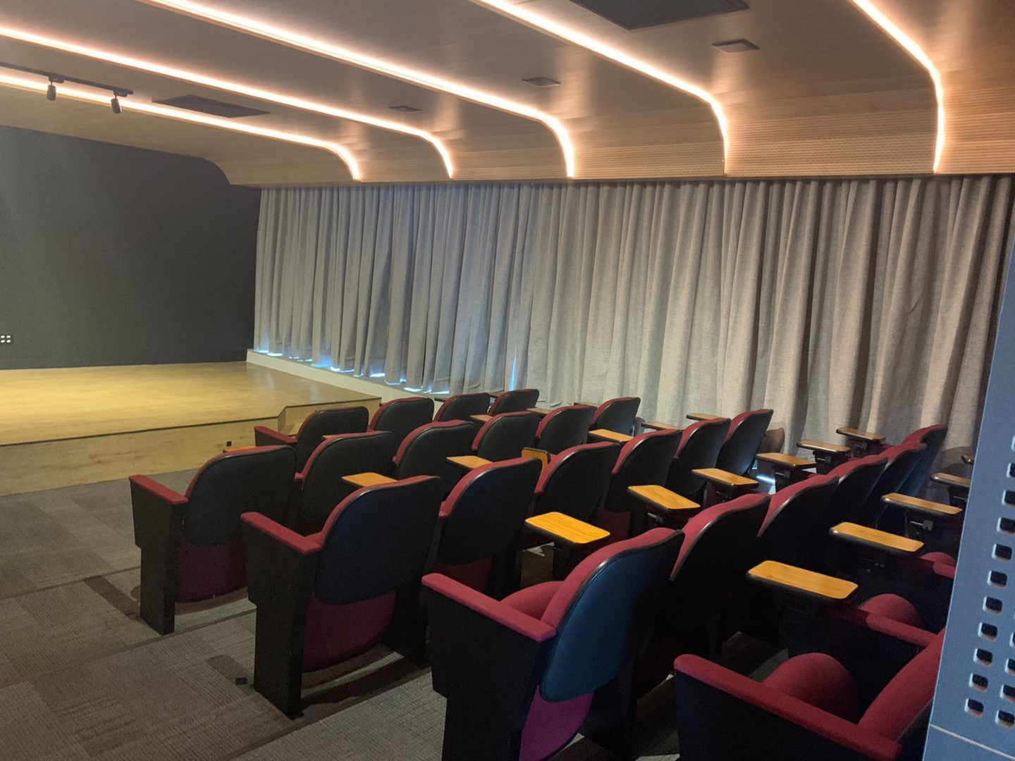 Auditório para 60 pessoas ( com cadeiras extras podemos atender 70 pessoas). Palco, cadeiras fixas, em desnível, com braços e apoio. Ar condicionado, wifi, isolamento acústico.