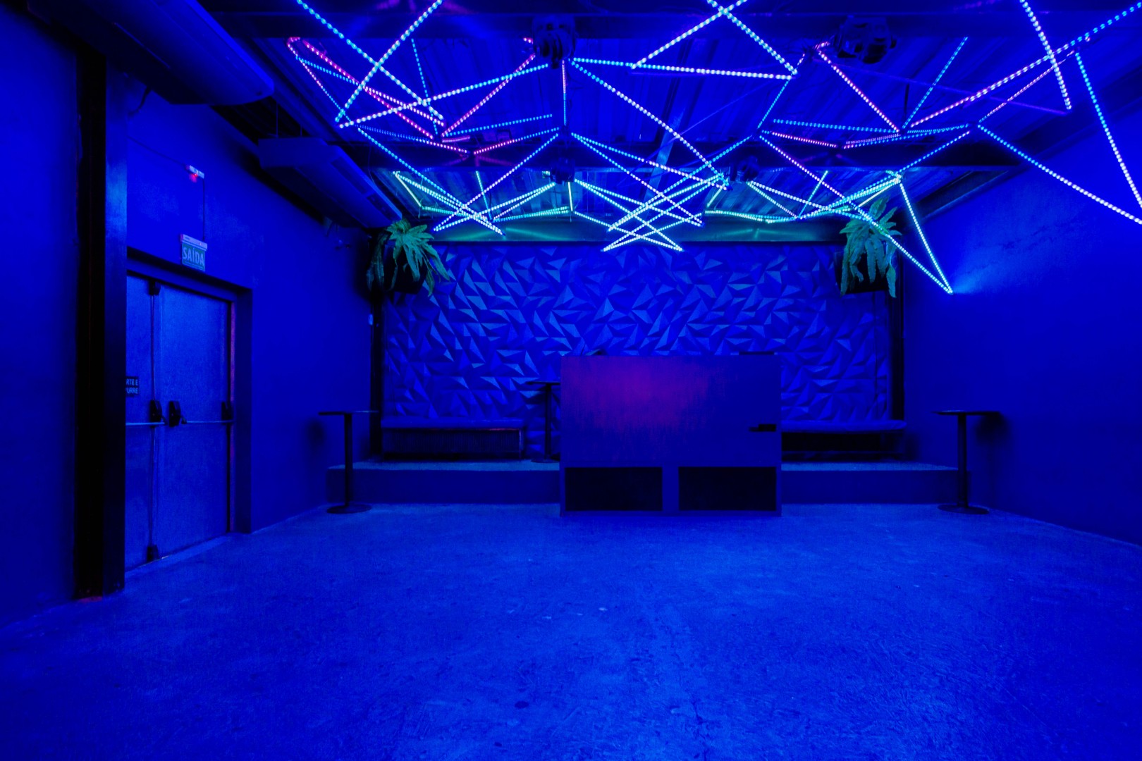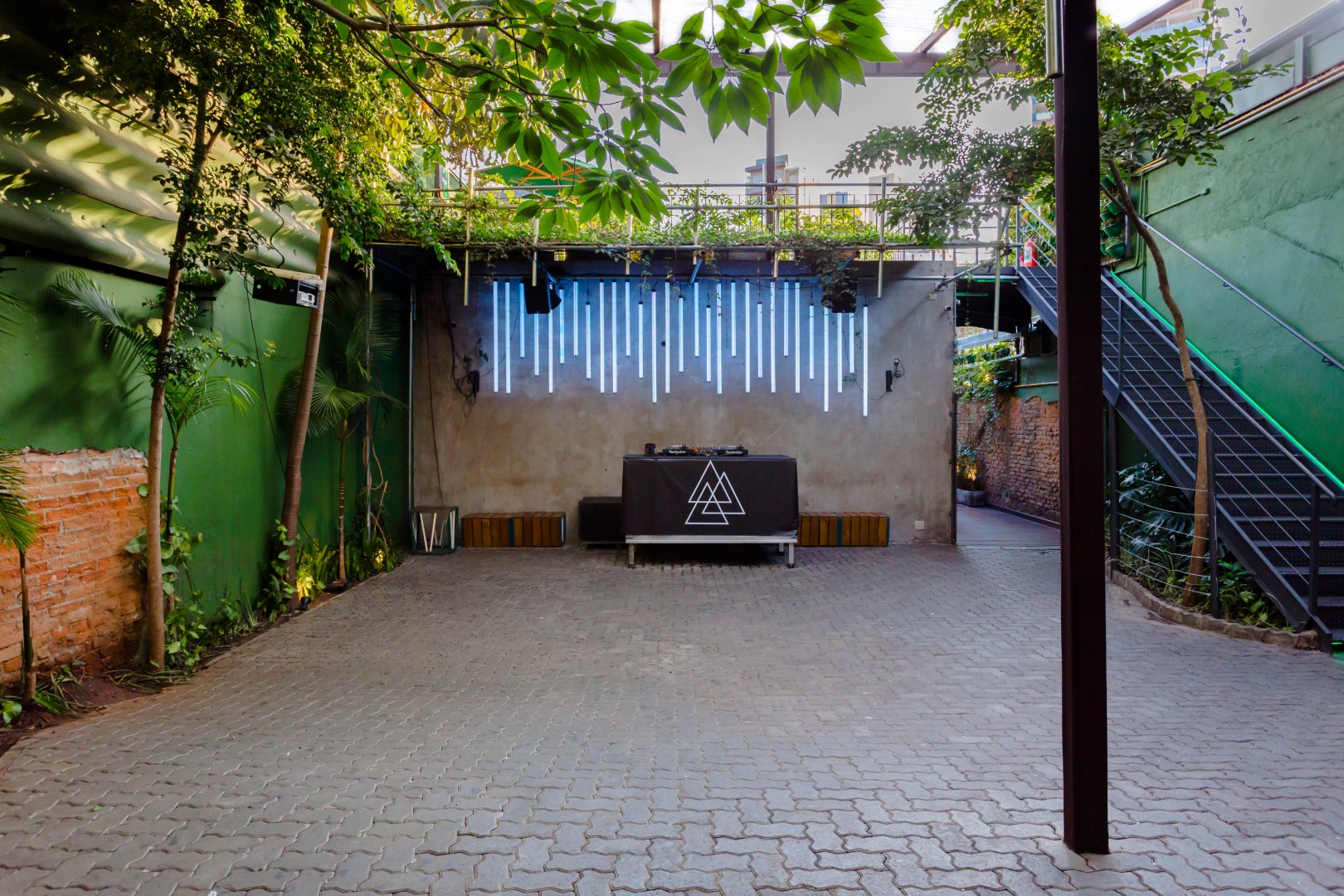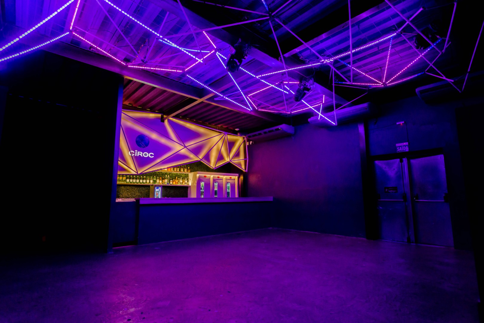 de dança ao ar livre, deckbar, rooftop e pista indoor com efeitos de iluminação