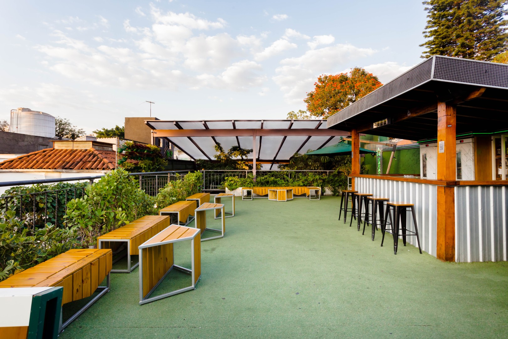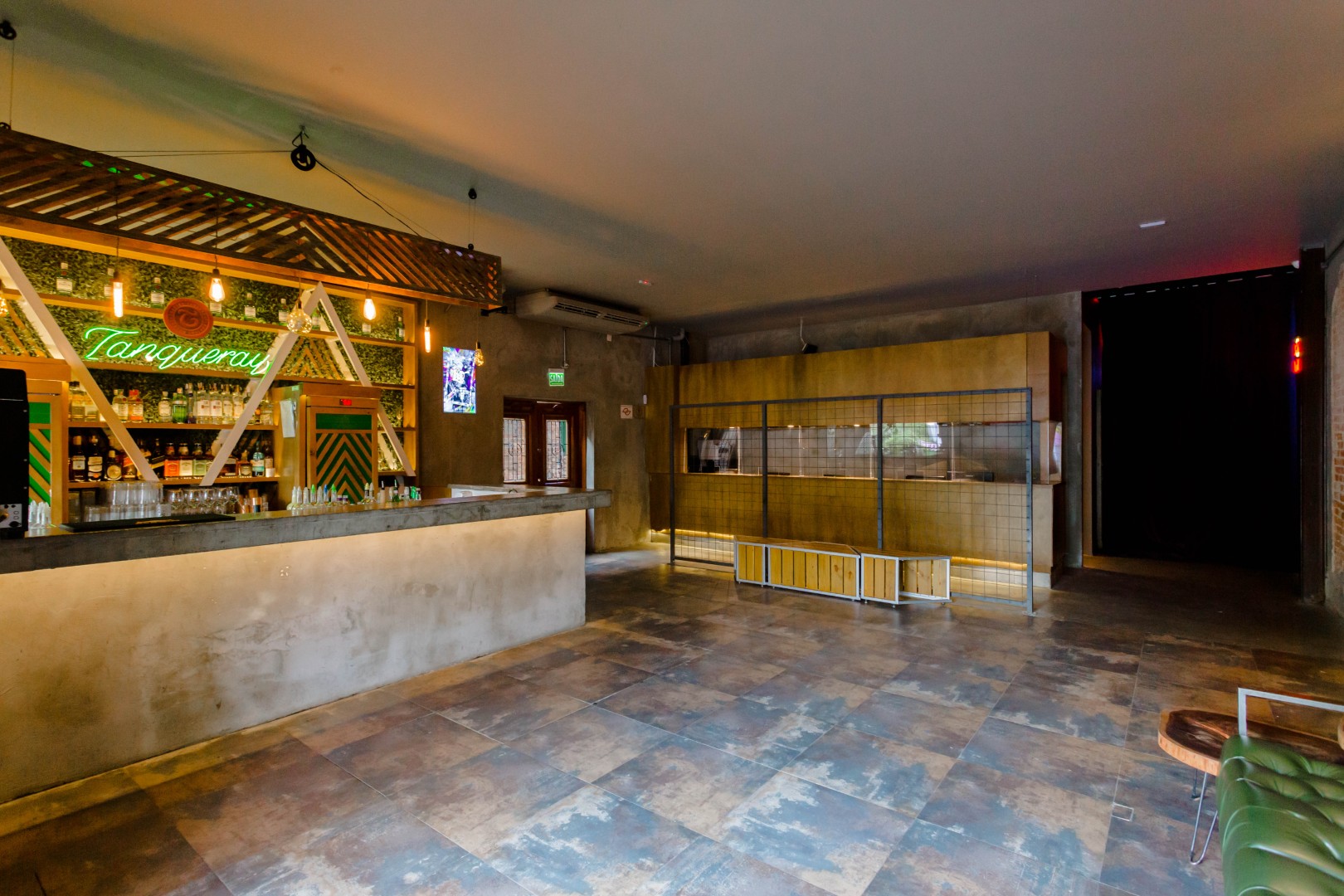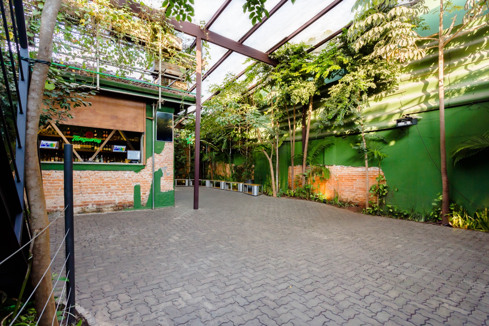 de dança ao ar livre, deckbar, rooftop e pista indoor com efeitos de iluminação