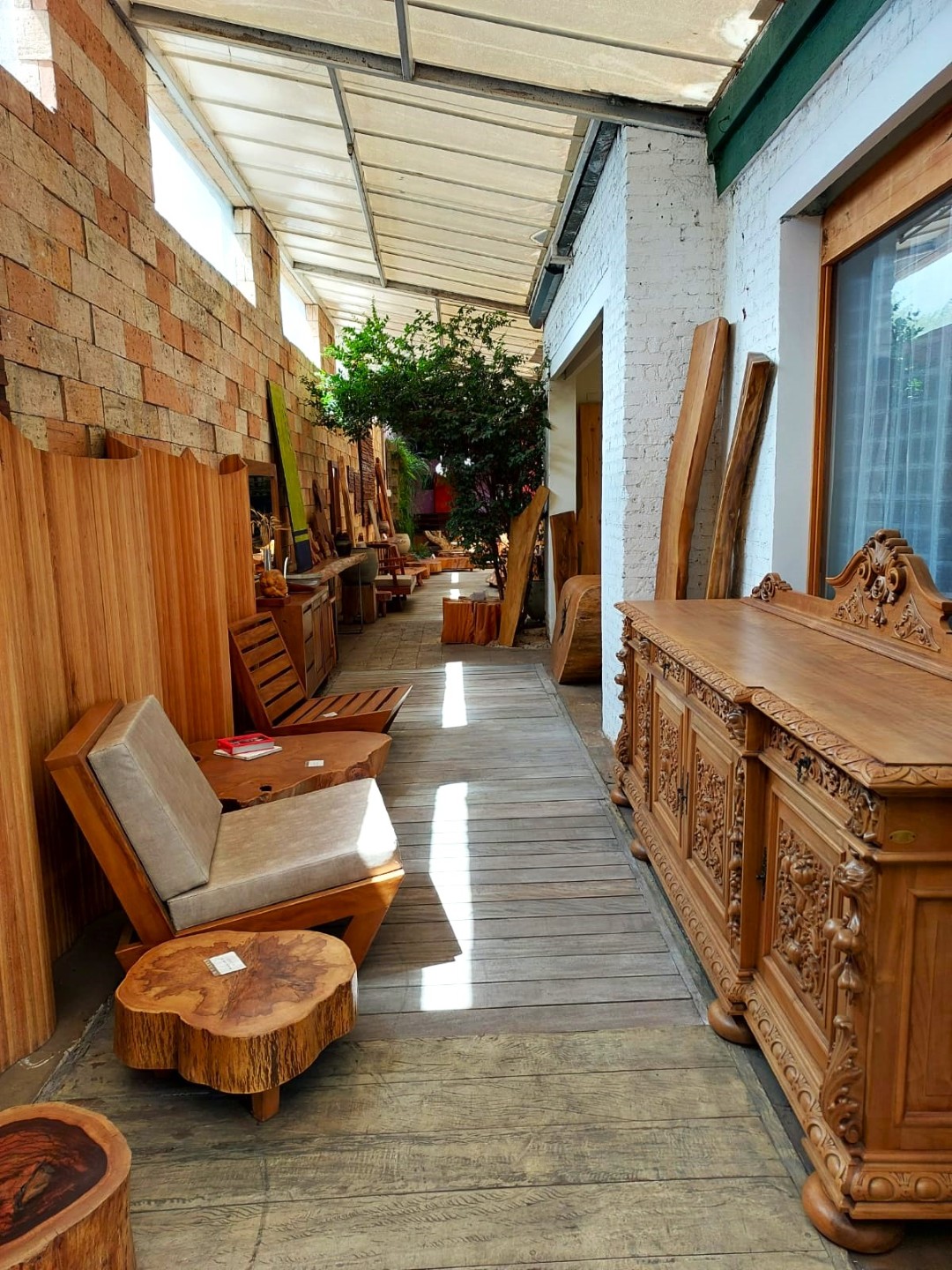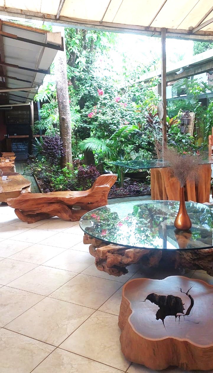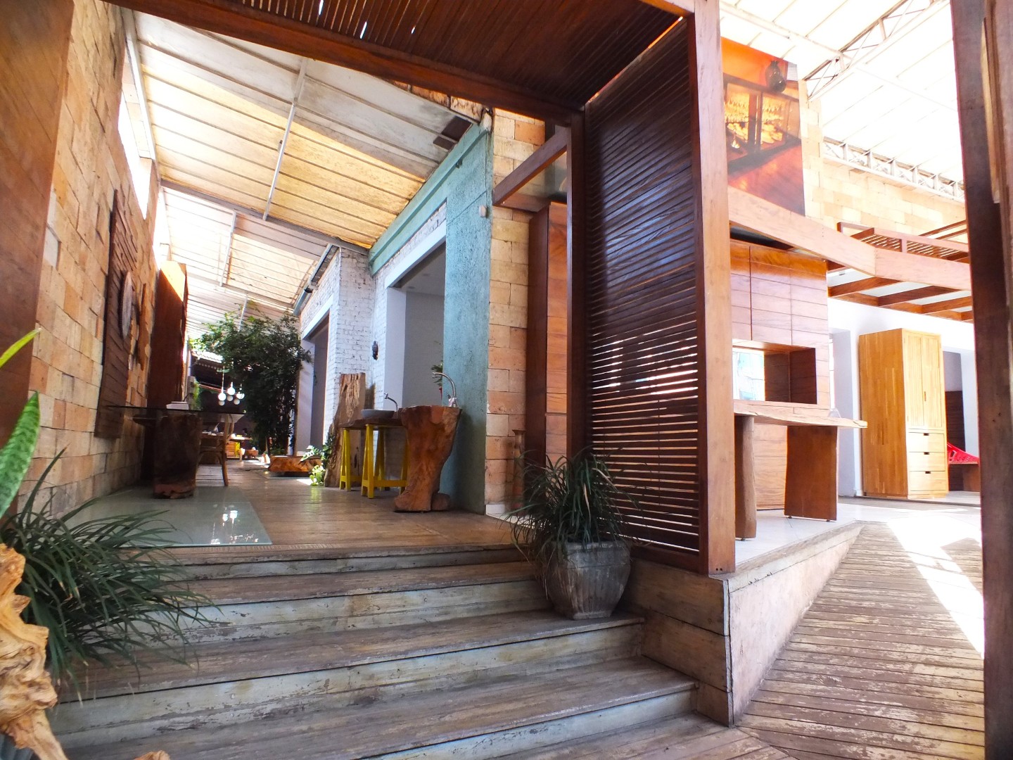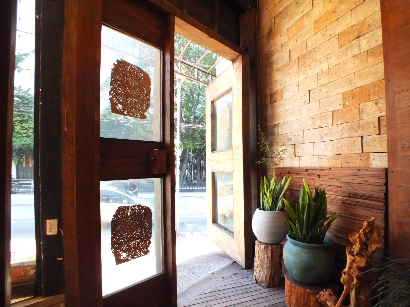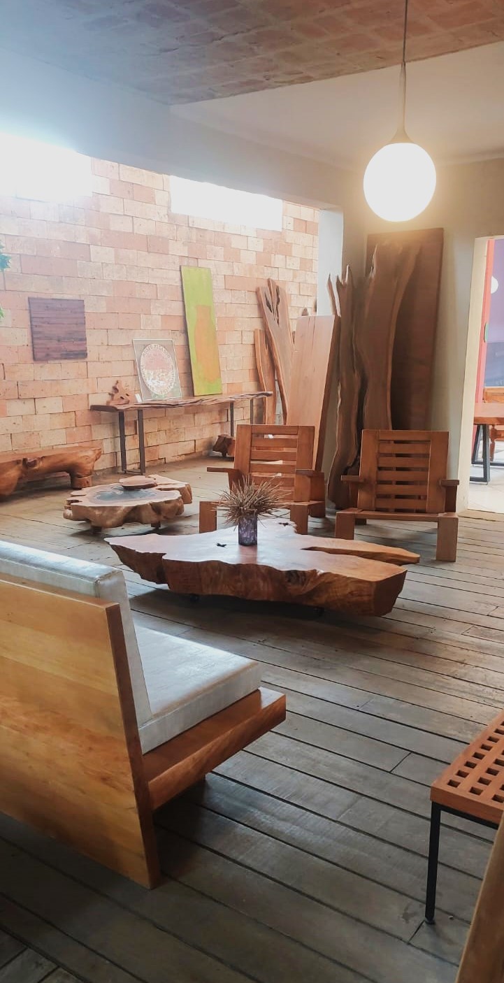 Este é o nosso espaço, verde, madeira, tijolos de barro, luz natural, móveis orgânicos.