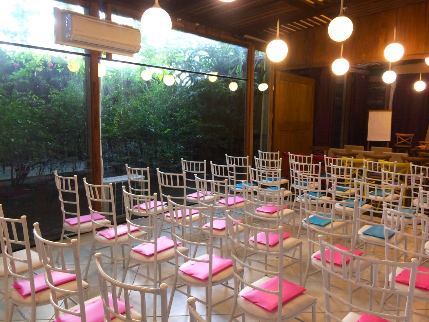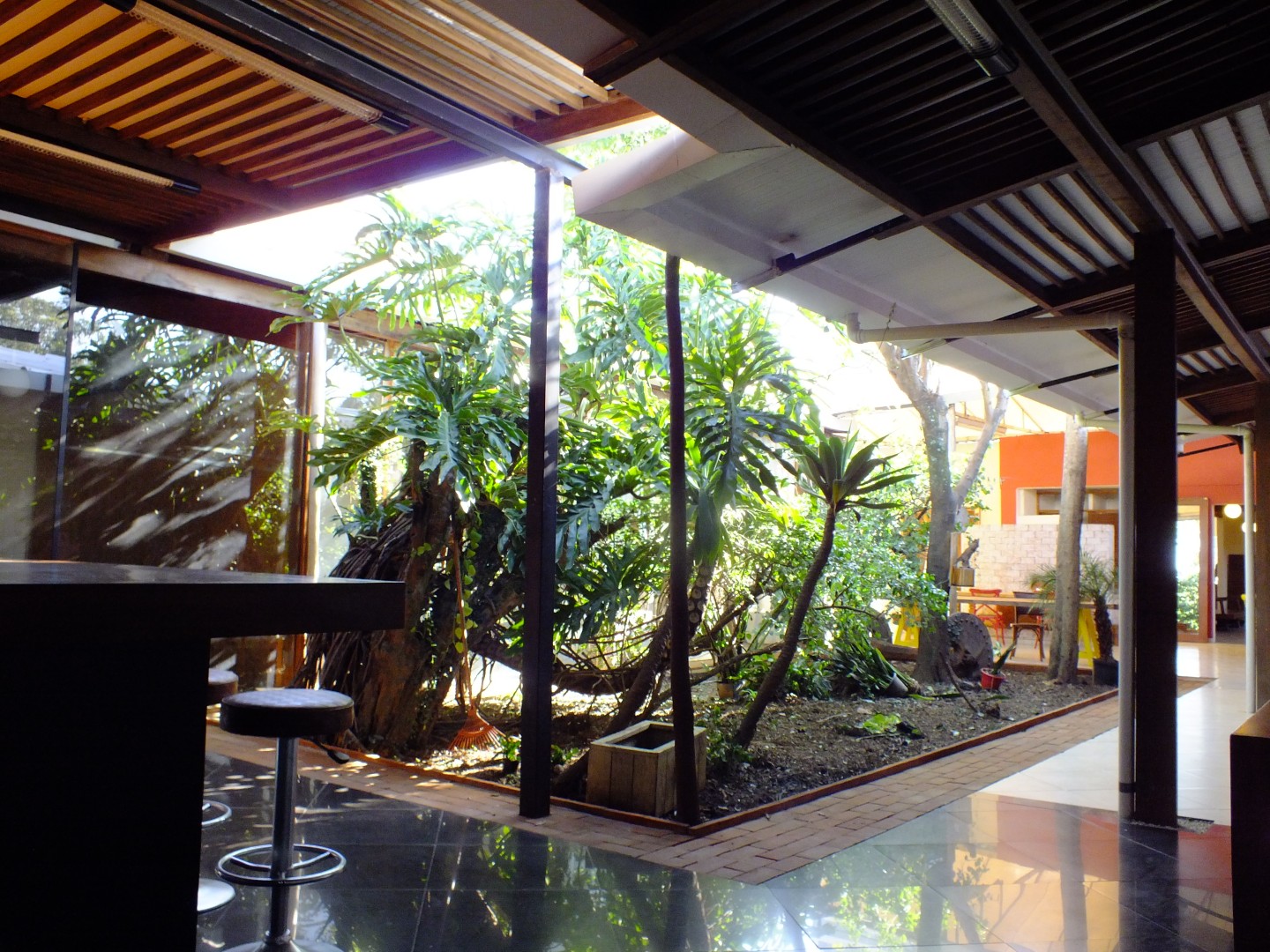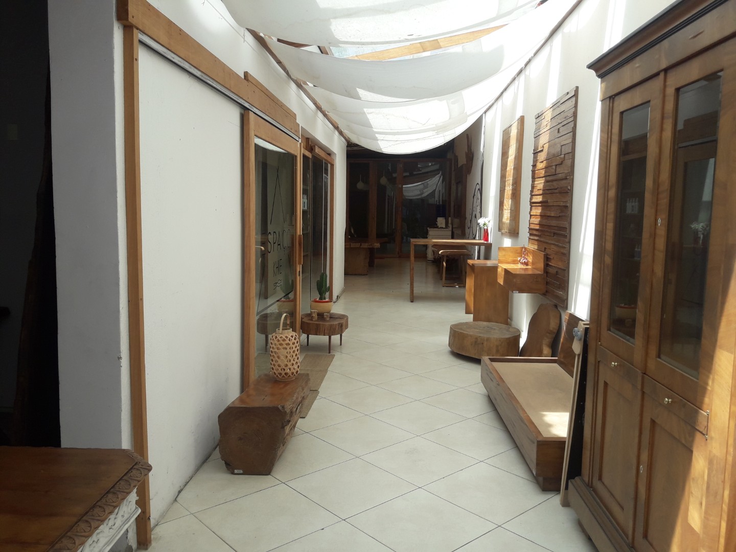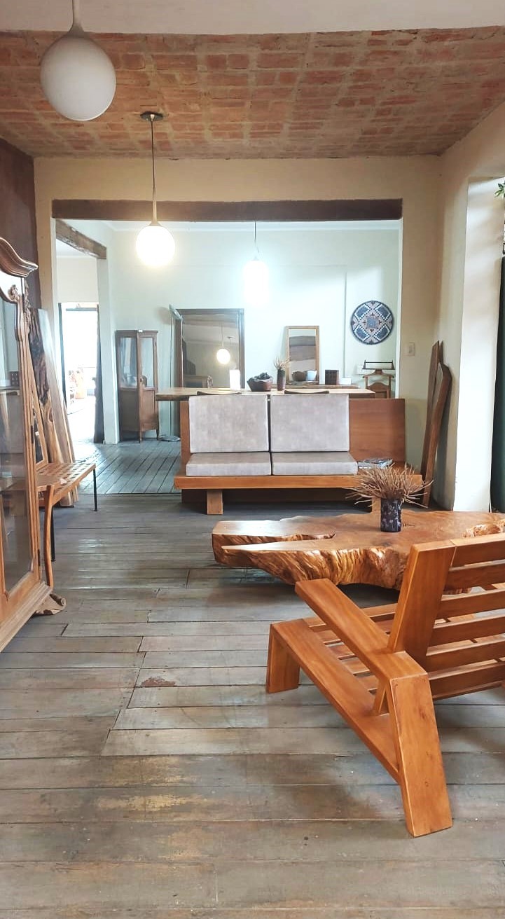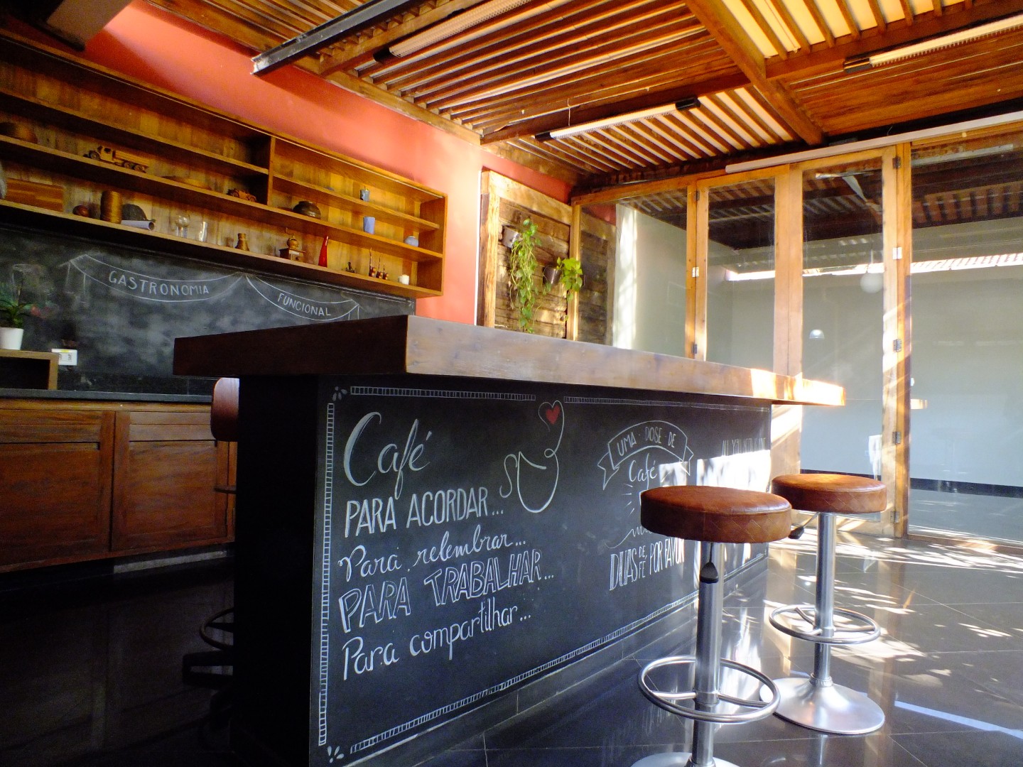 Este é o nosso espaço, verde, madeira, tijolos de barro, luz natural, móveis orgânicos.