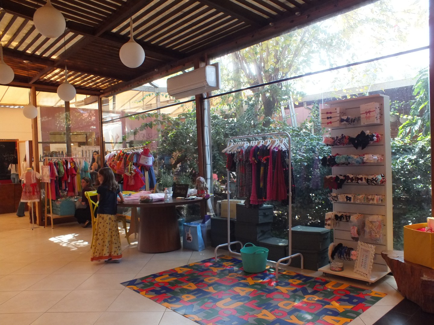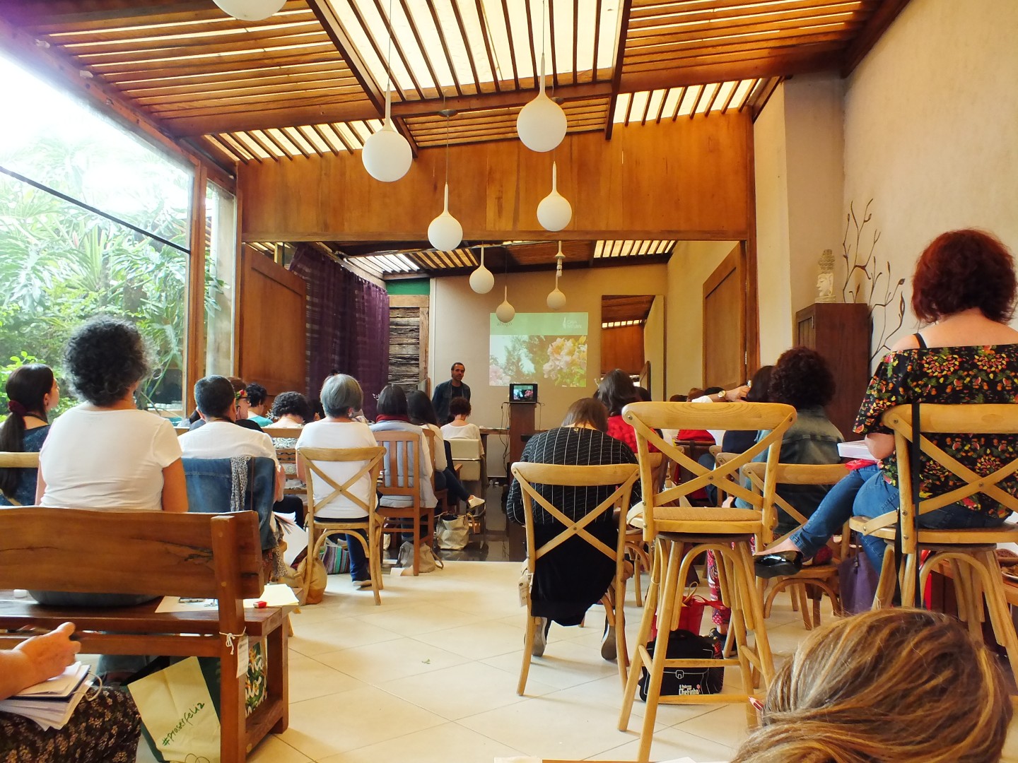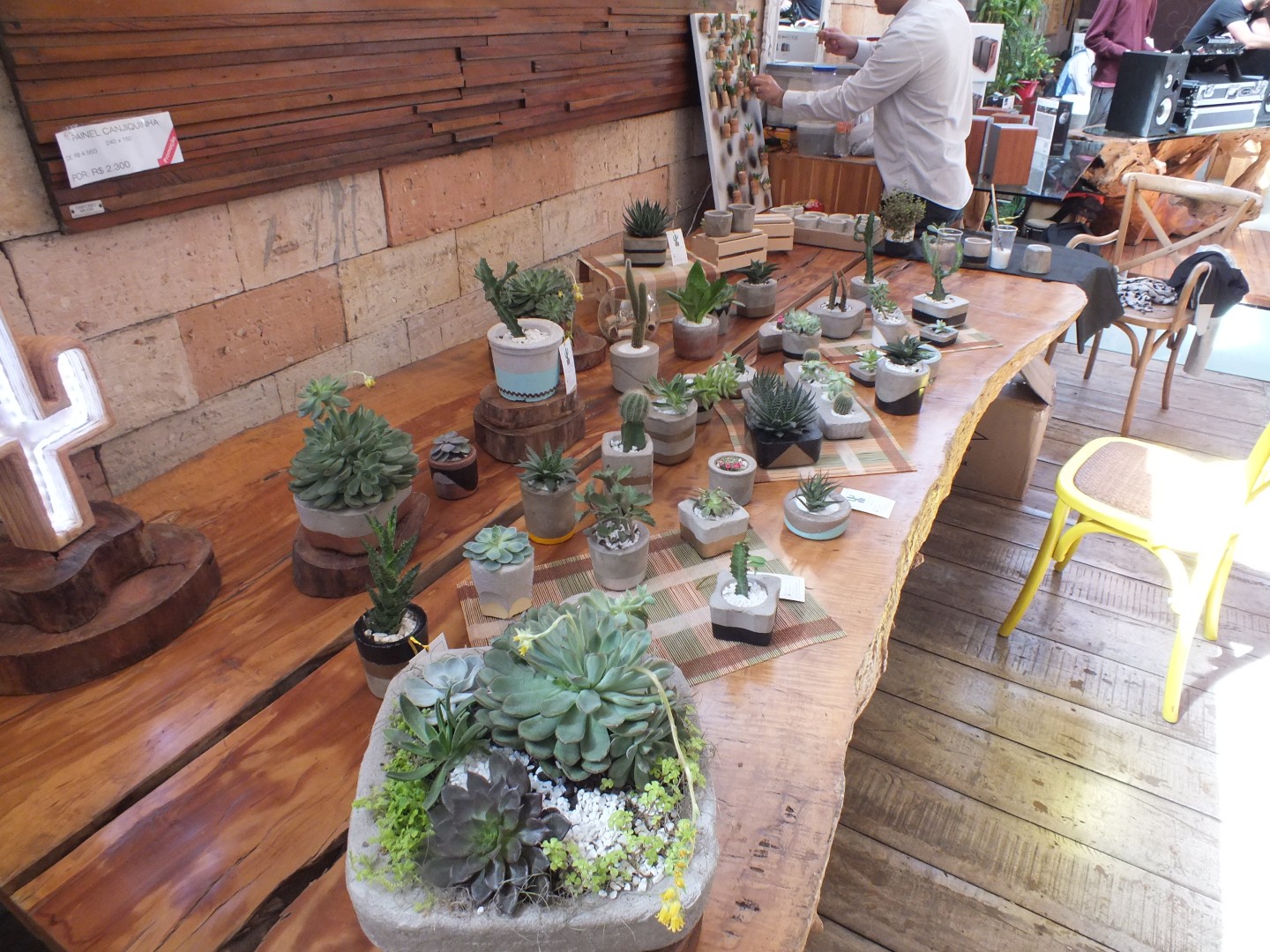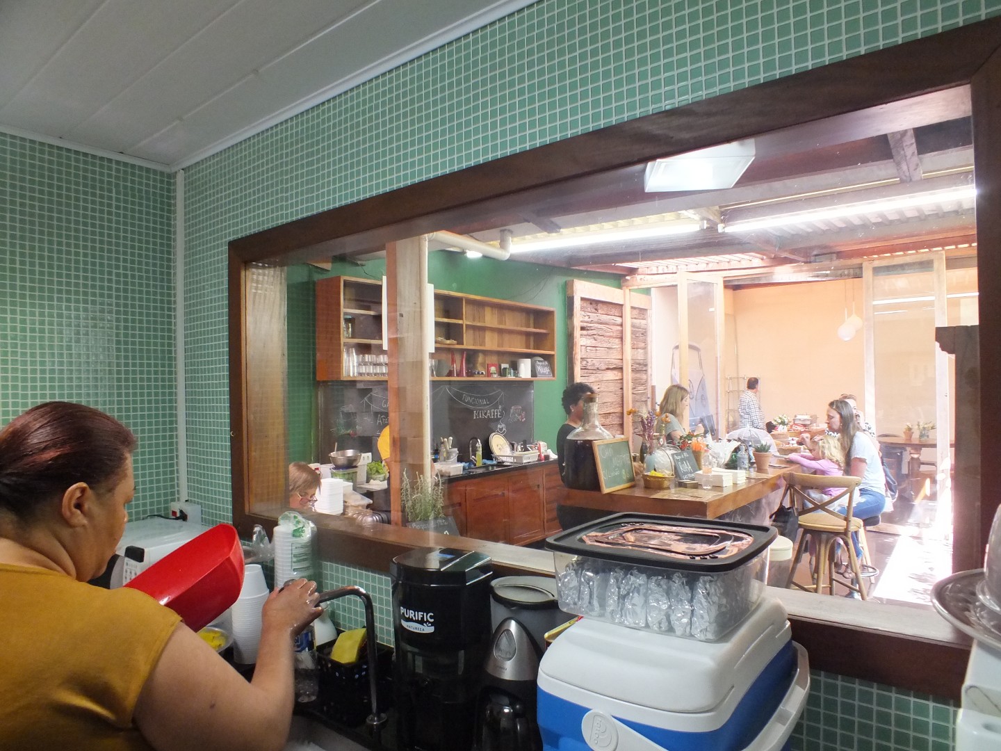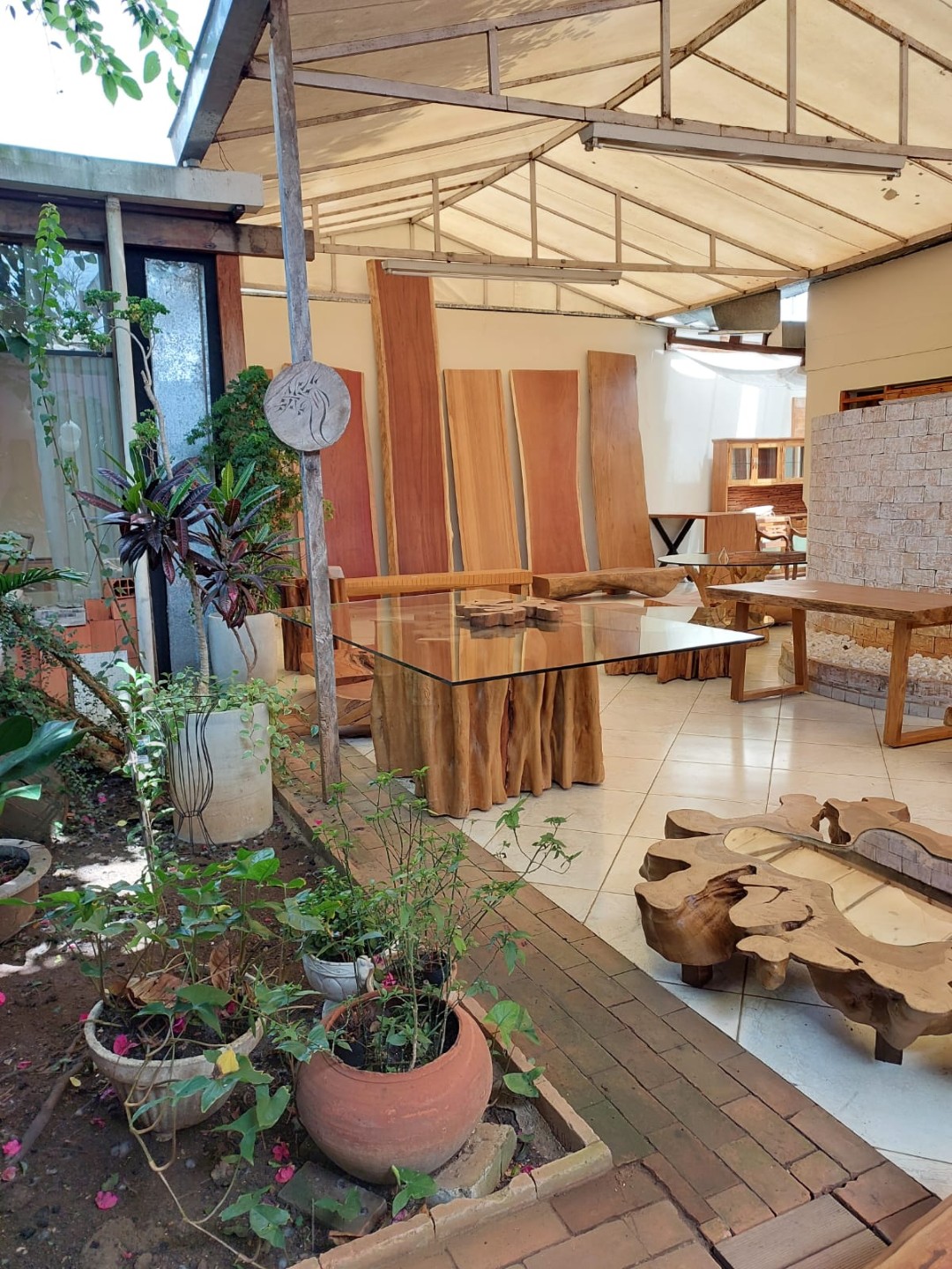Este é o nosso espaço, verde, madeira, tijolos de barro, luz natural, móveis orgânicos.
