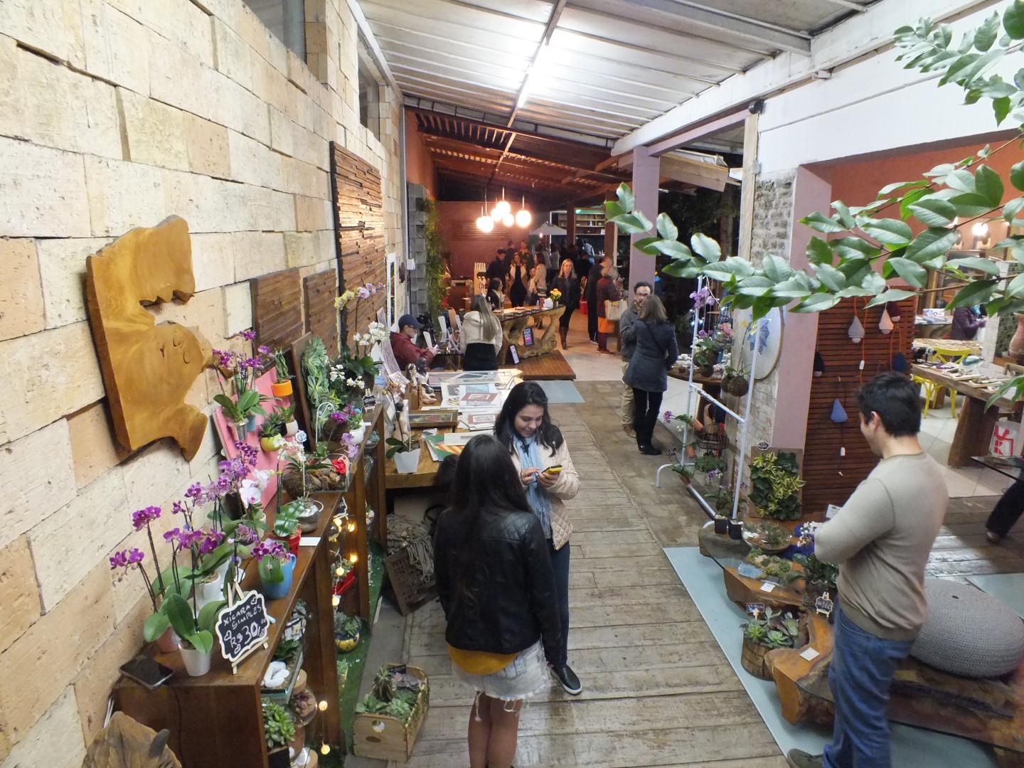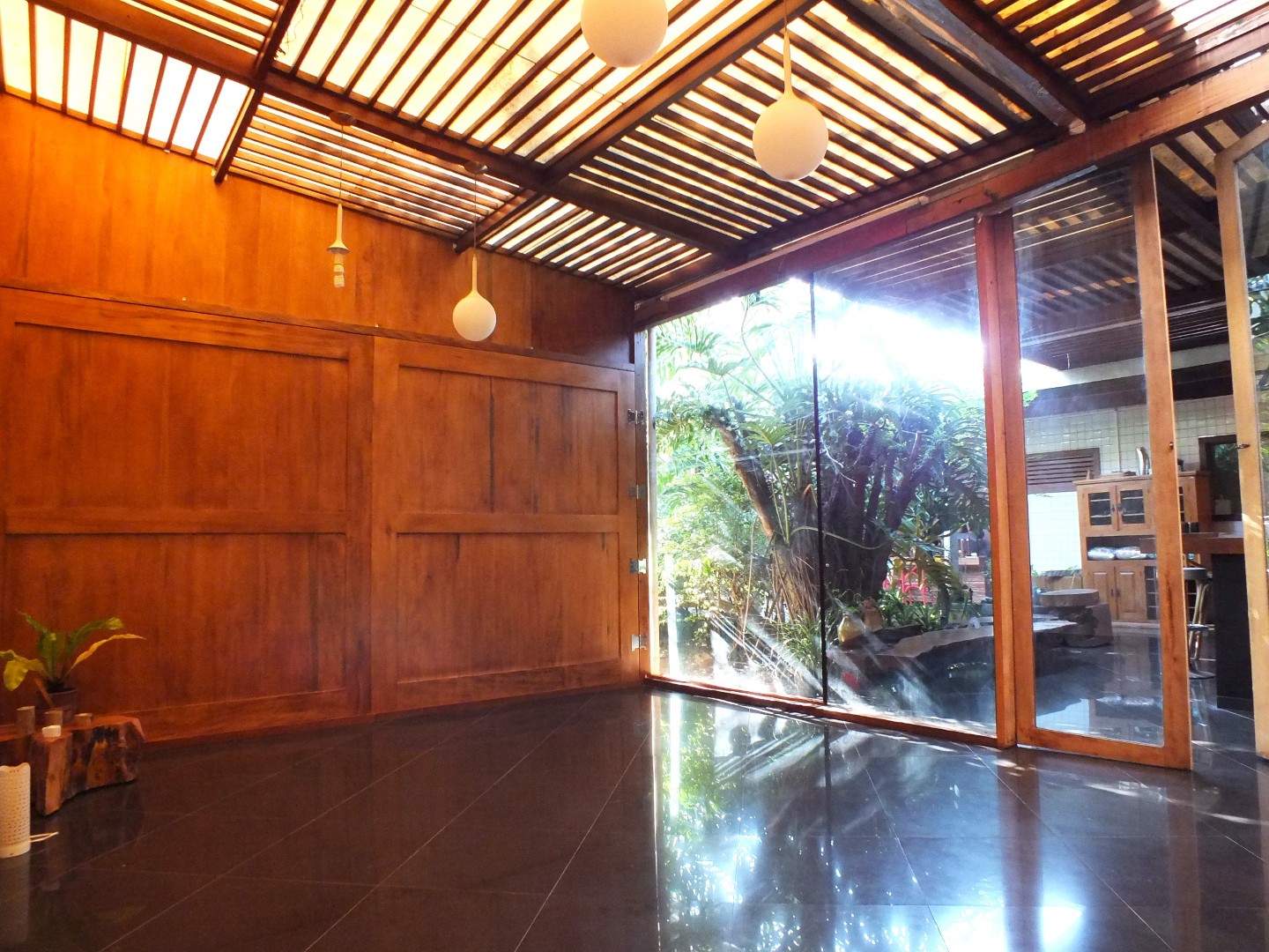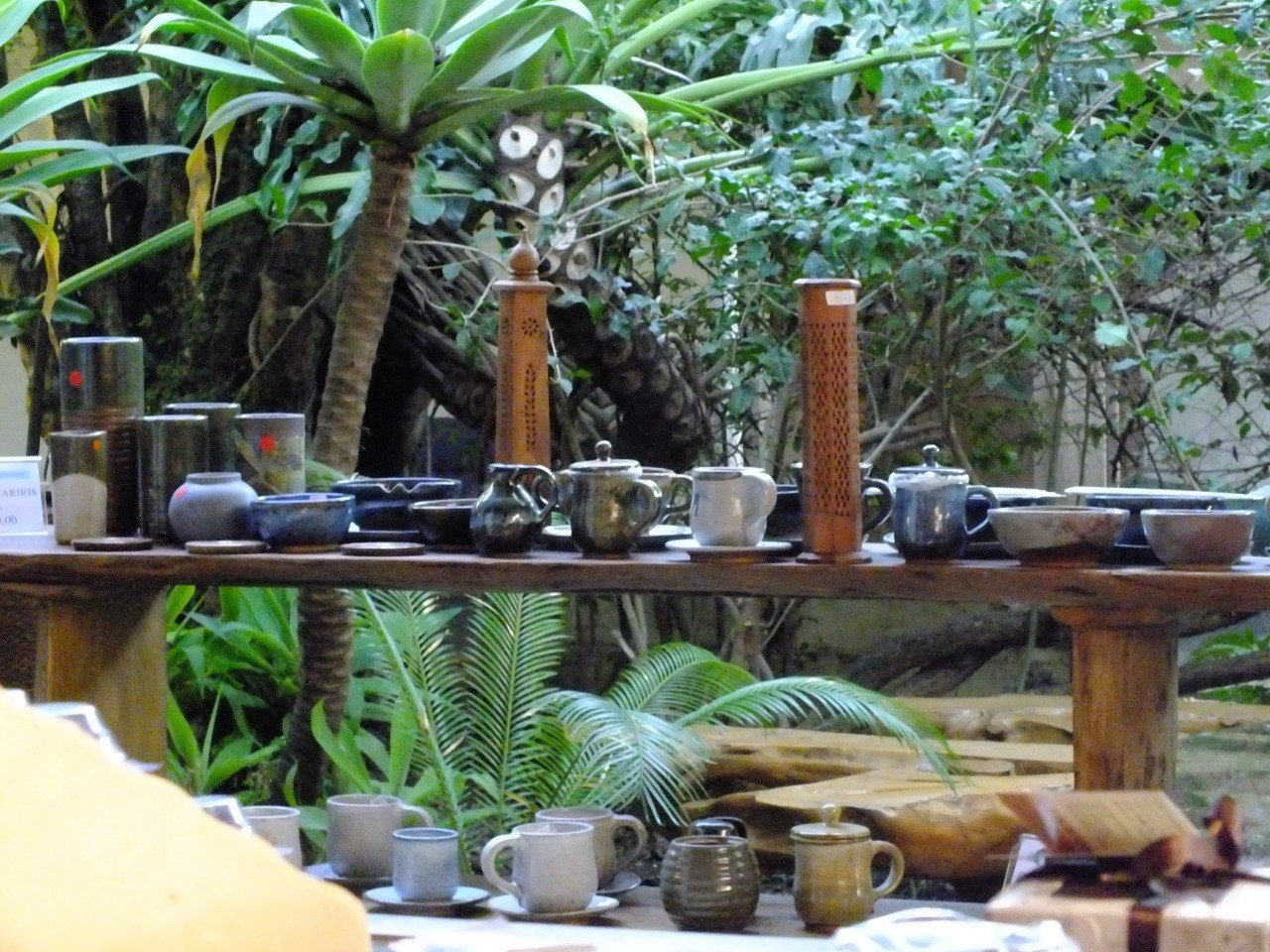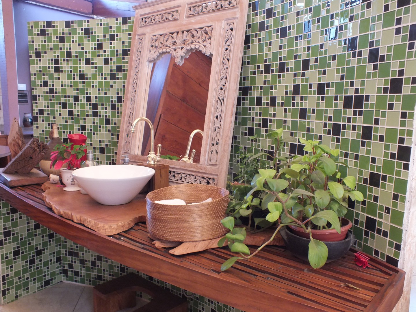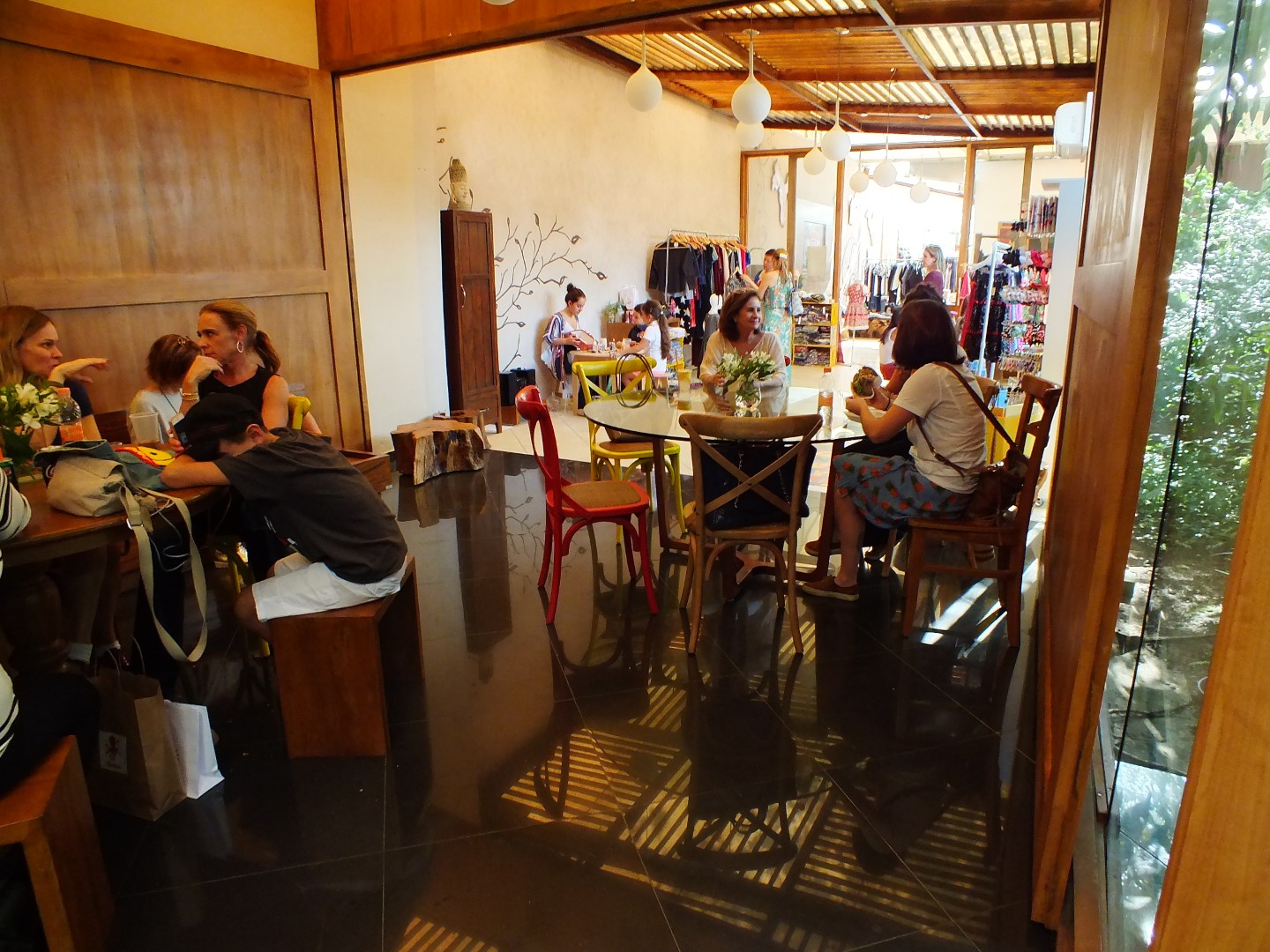 Este é o nosso espaço, verde, madeira, tijolos de barro, luz natural, móveis orgânicos.