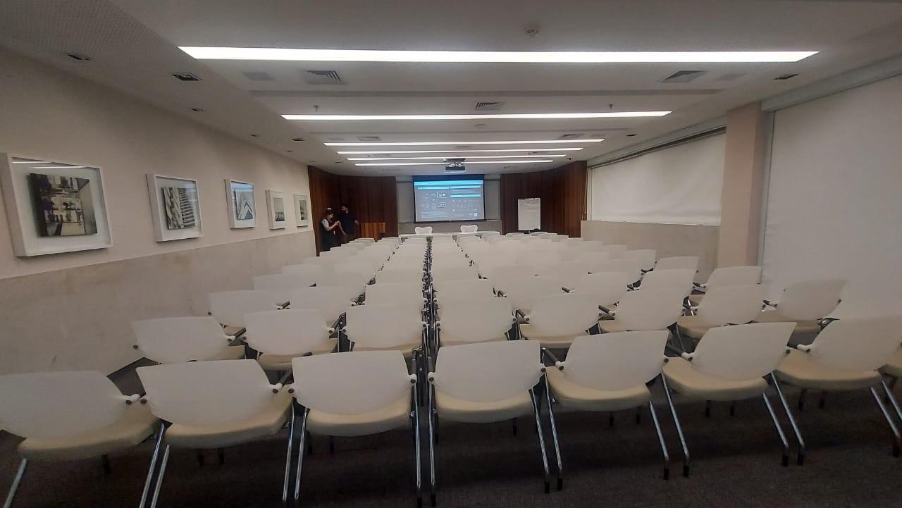 Auditório com capacidade para 100 pessoas, equipado com sistema audivisual de alta qualidade.
